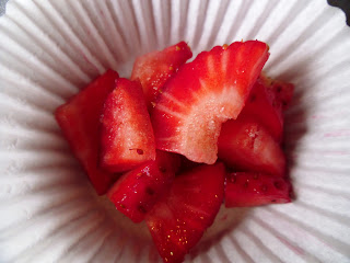 The next step was the chop up all the sumptuous strawberries that would be the base of my cupcakes. I must admit I couldn't help eating a few whilst I was chopping them up to small pieces. Once cut I then divided them into the cupcake cases and moved onto making the cupcake mixture. This was a simple vanilla mixture from the Hummingbird Bakery cupcake book and yet again, I might have wiped up the last little dribbles with my finger... delicious!